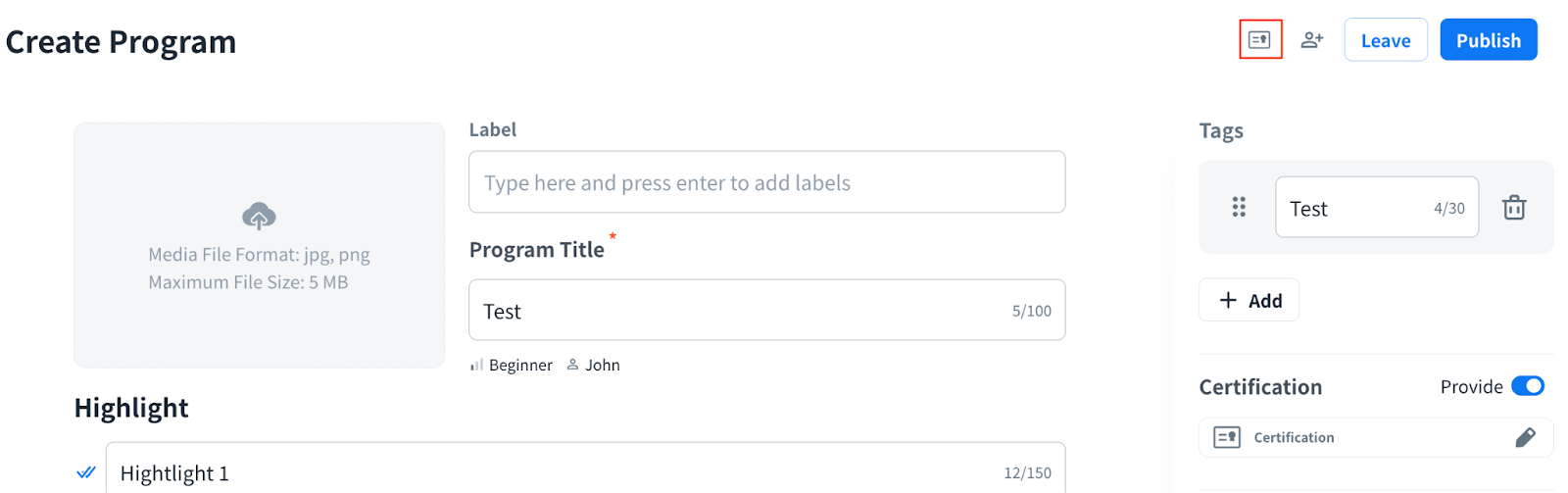 Toggle “Provide” button on Certificate section when the program is able to provide a certificate to your users (Default is off).