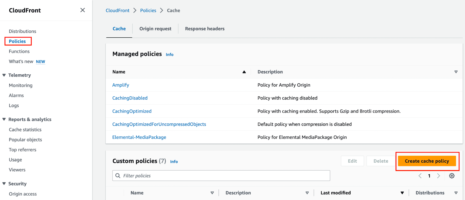 • Go to Policies and click Create cache policy. Create the following policies according to the parameters provided.