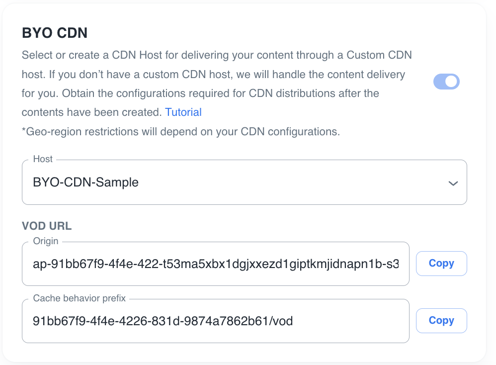1. If you wish to enable BYO_CDN for a VOD, use the toggle to enable it and select a created Host from the dropdown.
