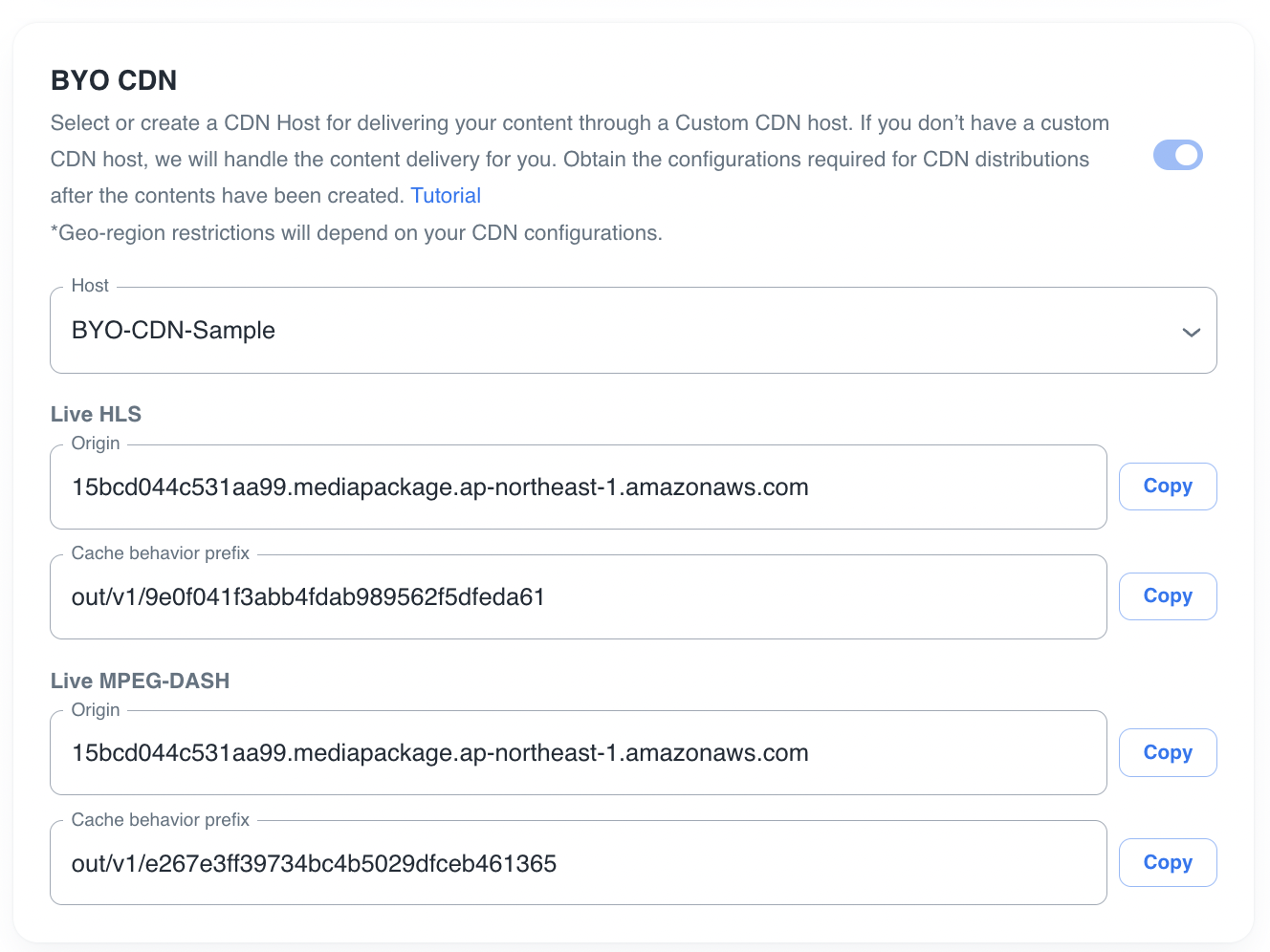 Note: You can modify created Distribution Host but note that it may affect the playback for Livestreams or VODs that you have enabled BYO_CDN. We recommend modification after the Livestreams or VODs have been completed playback not prior.