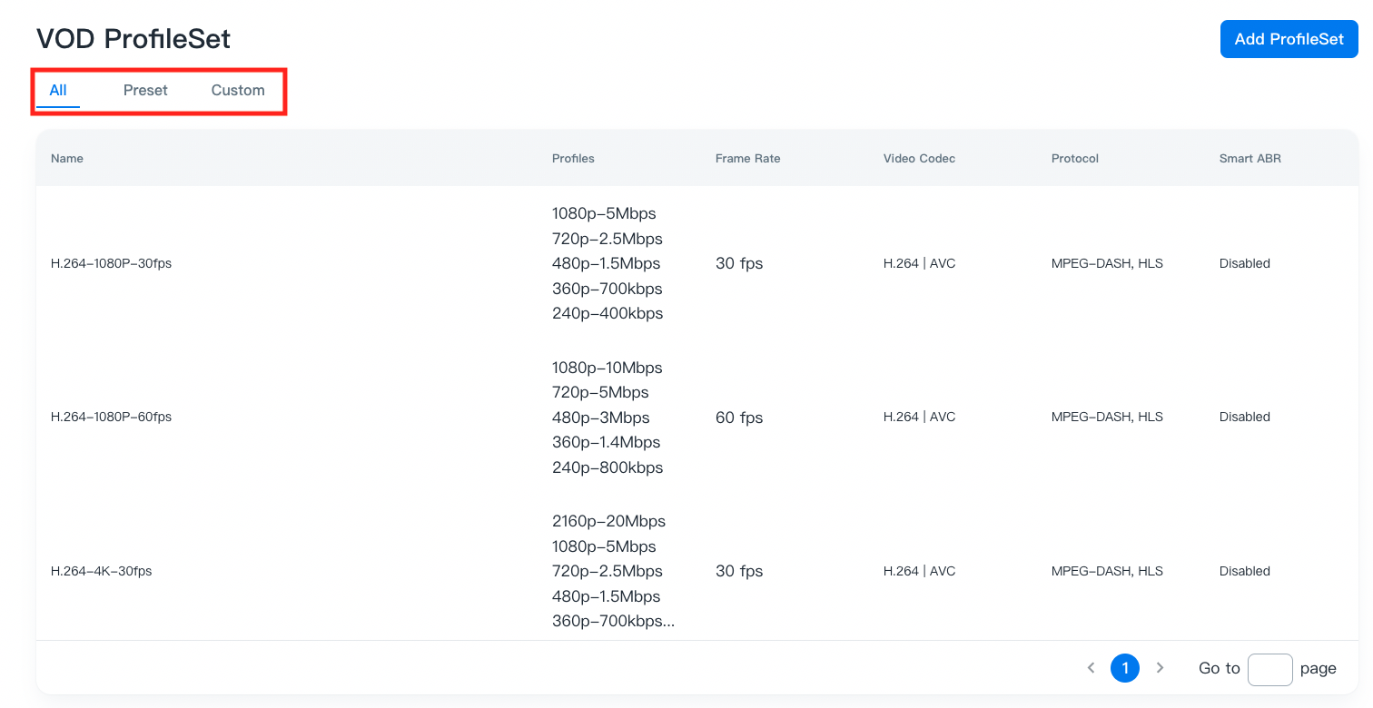 After ProfileSet is created, you can confirm current VOD ProfileSets that you can use in All/Preset/Custom tab and manage the ProfileSets.