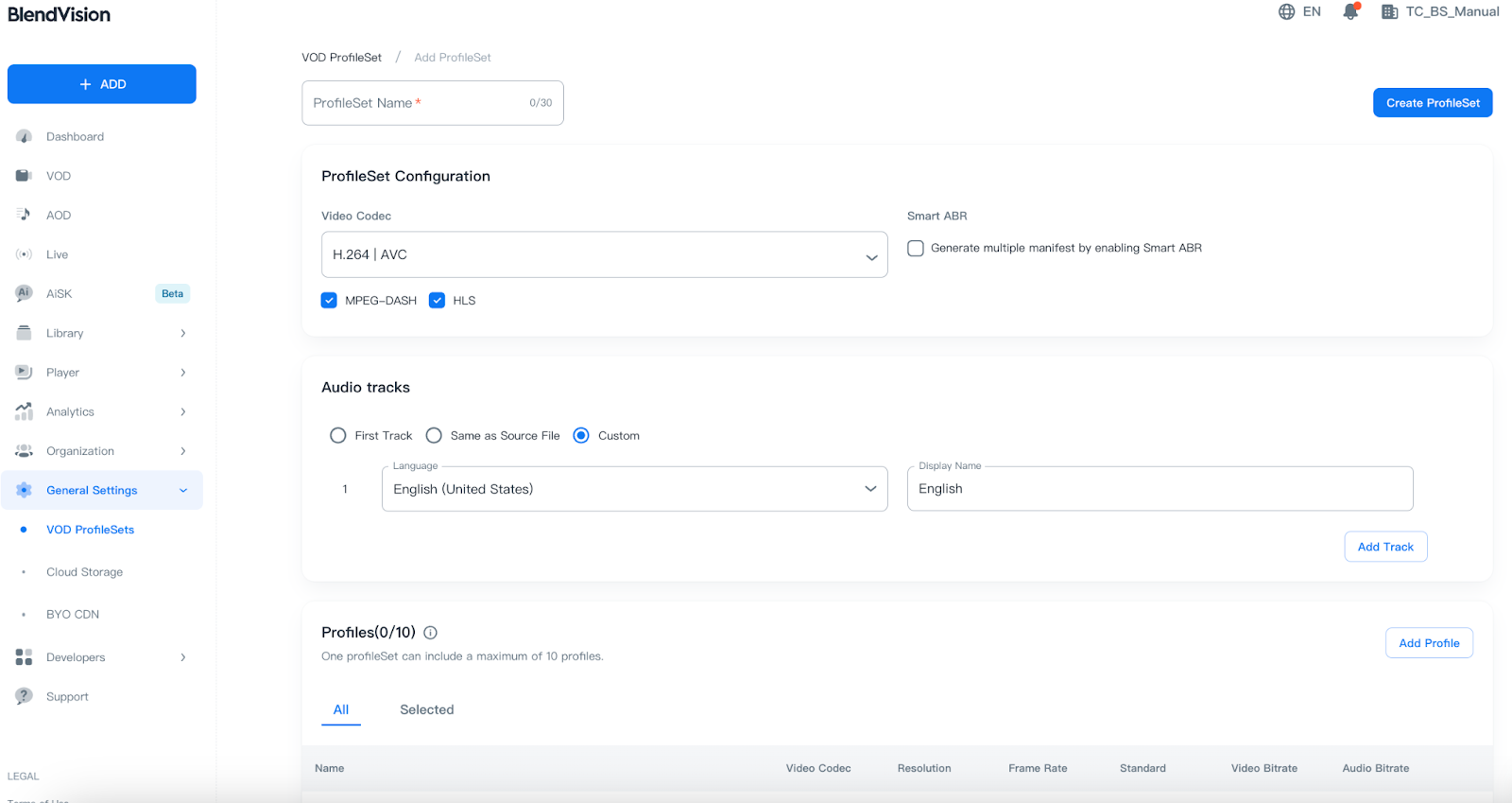 1. Press “General Settings” on the left sidebar on BlendVision Web Console, then click “VOD ProfileSets” to access VOD ProfileSet list.