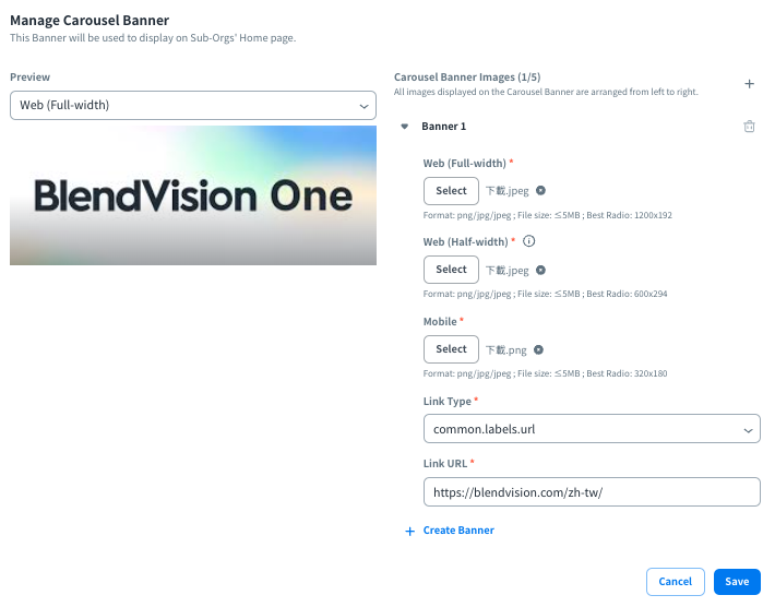 Upon the BlendVision AiM service, at the Home page on the left sidebar, you can confirm the information of carousel banners, tasks, spaces, the content collections and assets.