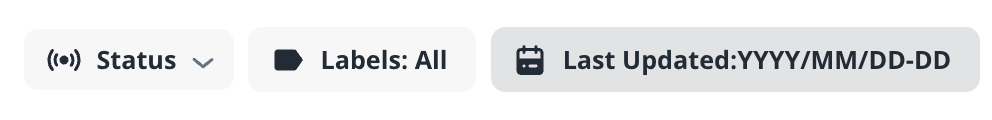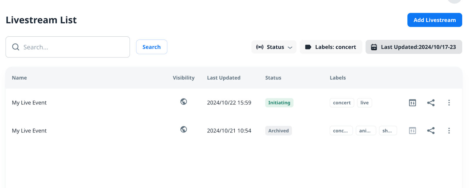 You can filter the live events by their statuses, labels, or last updated time from Status, Labels: All and Last Updated:YYYY/MM/DD-DD bars at the upper-right side in Livestream List.