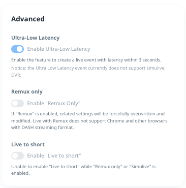 - Enable / Disable Live-to-VOD: This option will be uneditable after the event is created.