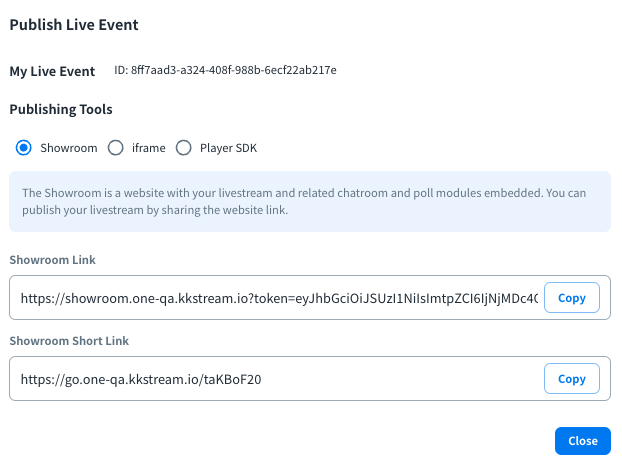 When your live is ready, you can click the share icon to share your live event to the audience via Showroom/iframe/Player SDK.