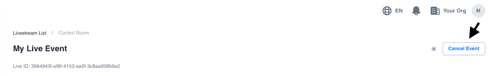 On the upper-left side of the control room page, you will see the Livestream name and and unique Live ID of your event: