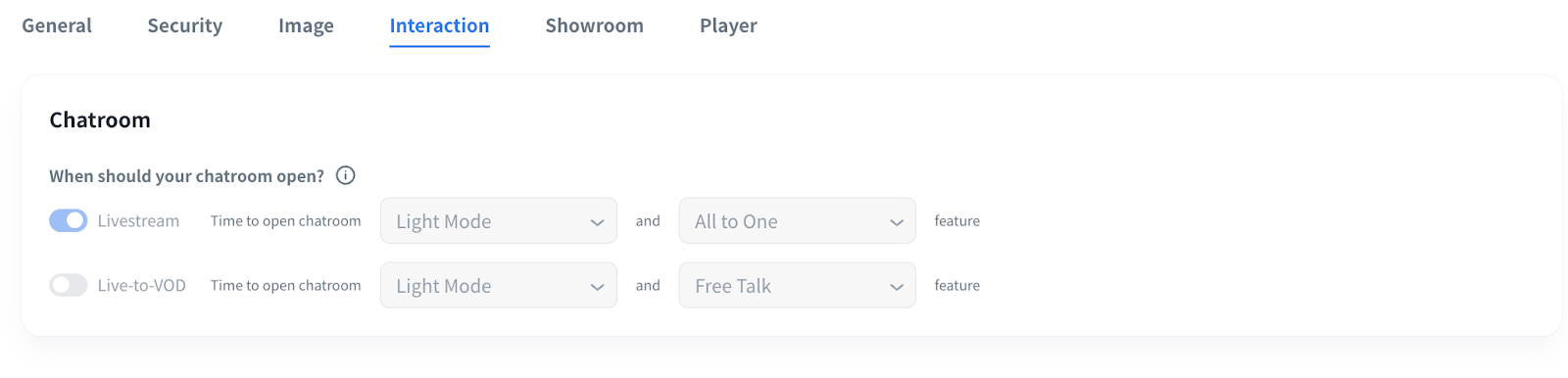 The control room provides different functions to manage the chatroom available in the showroom/embed iFrame player. Please refer to Manage Chatroom while Live for more details.