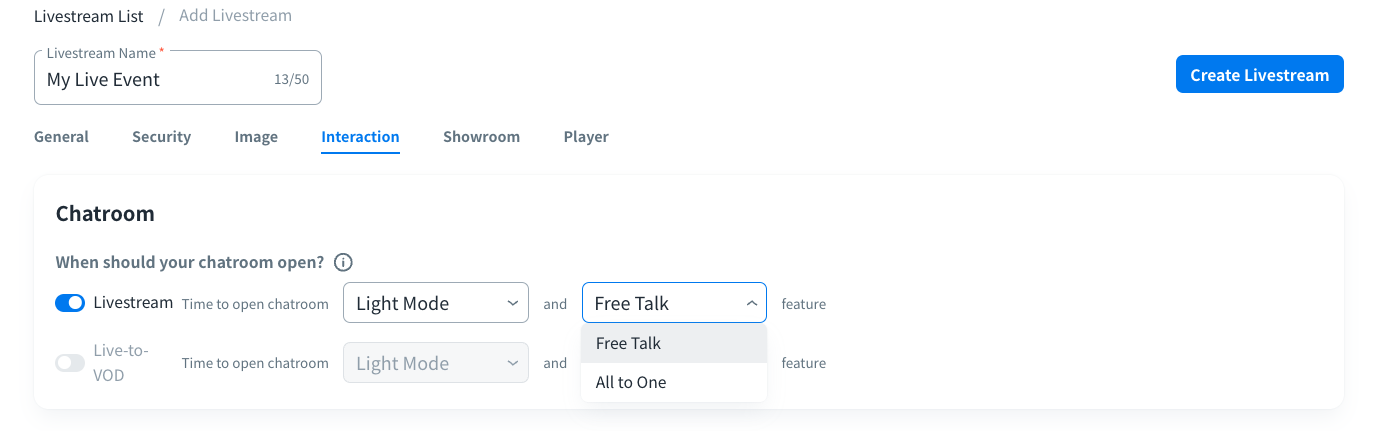 - Live-to-VOD: this option is available only when you have enabled the Live-to-VOD function. The chatroom will be available during the Live-to-VOD publishing period (Status: VOD).