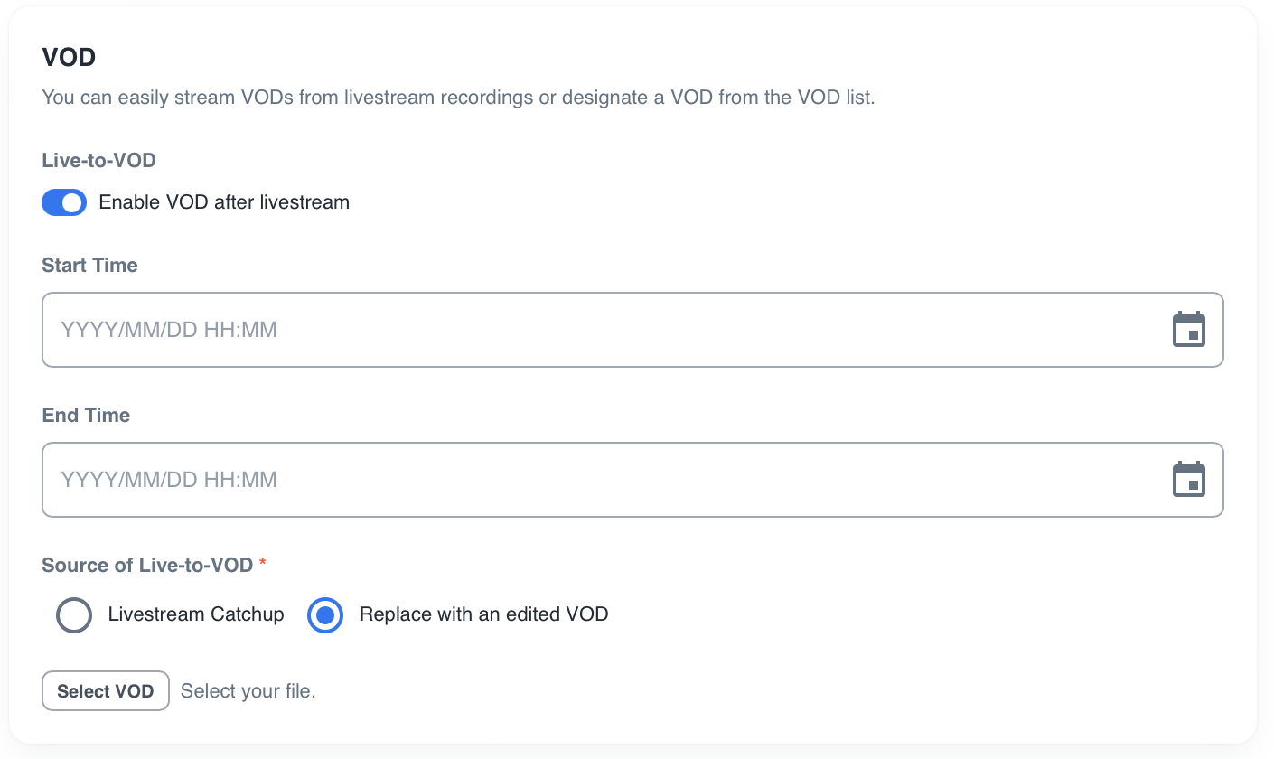 Enter the start and end time of your VOD session while taking your editing time into account. The "Select VOD" option can be left blank for now.
