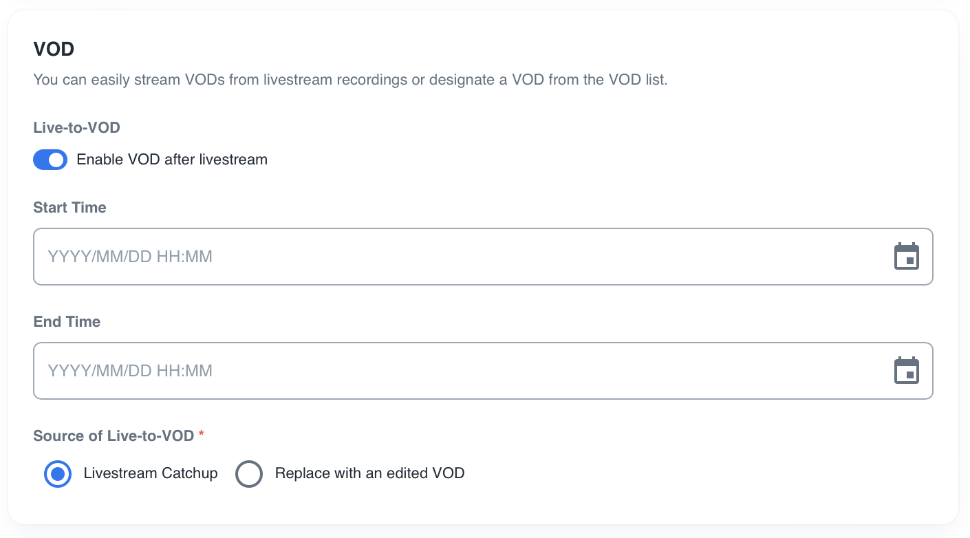 Use this feature if you want to replace the VOD with a different piece of source content after the live event. You may also edit the Livestream Catchup before using it as the new source file.