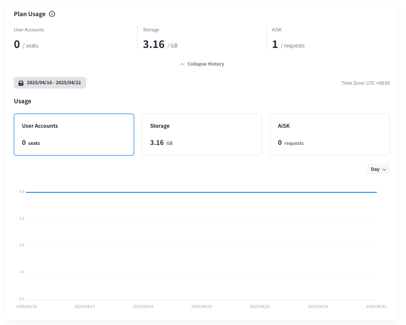 You can confirm the total user accounts, storage and AiSK request of usage within your organization.