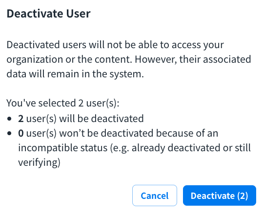 • Deactivate: Deactivated users will not be able to access your organization or the content. However, their associated data will remain in the system.