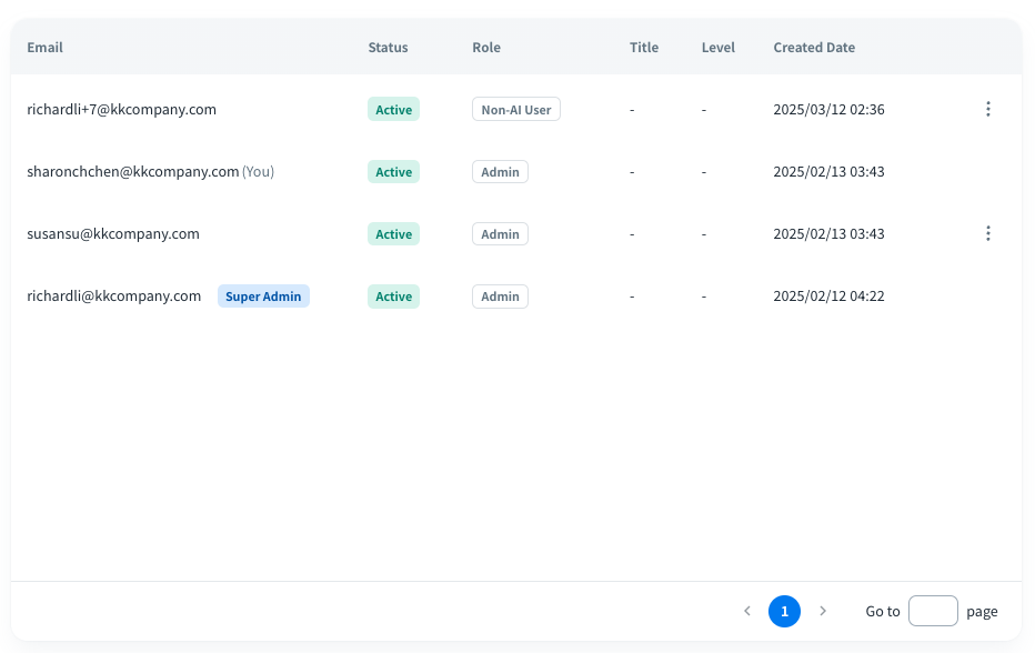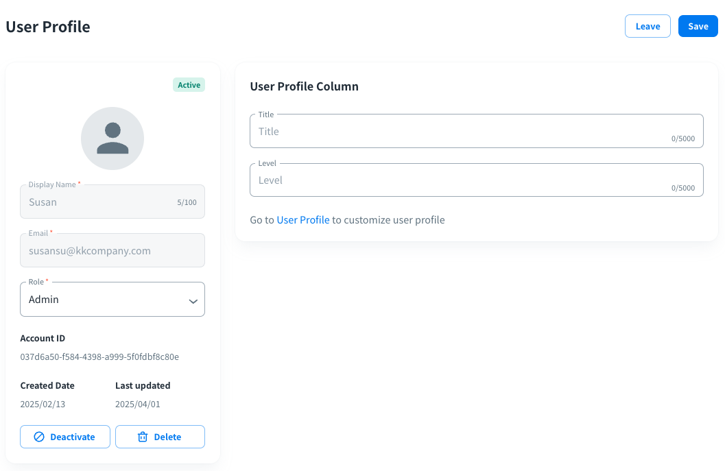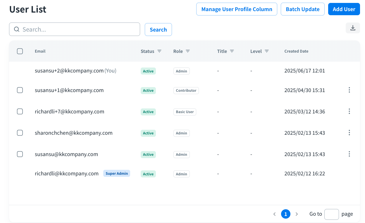 In the Users page, you can easily confirm user accounts and their roles or other custom information in your organization with a centralized user list.