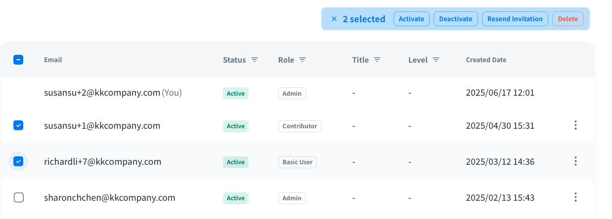 • Resend Invitation: An invitation email will be resent to the selected users, allowing them to join your organization.