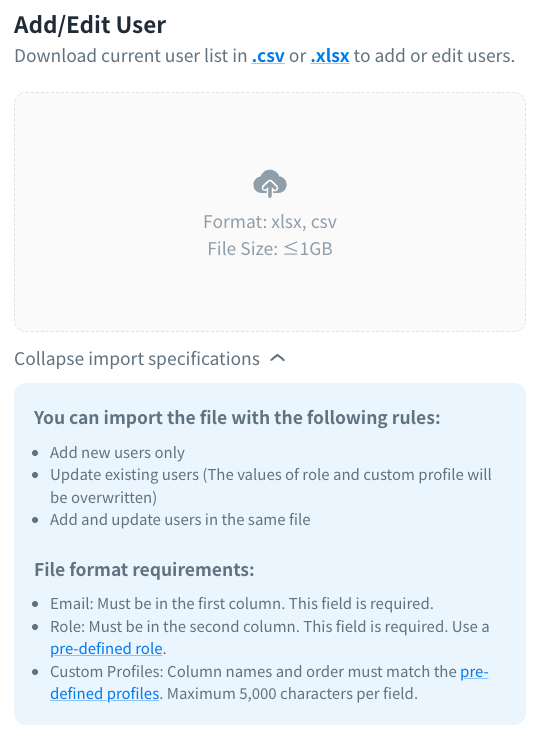 Select the action you want to execute and download the current user list in  .csv or .xlsx. Expand the import specifications to confirm the imported rules as revising the file.