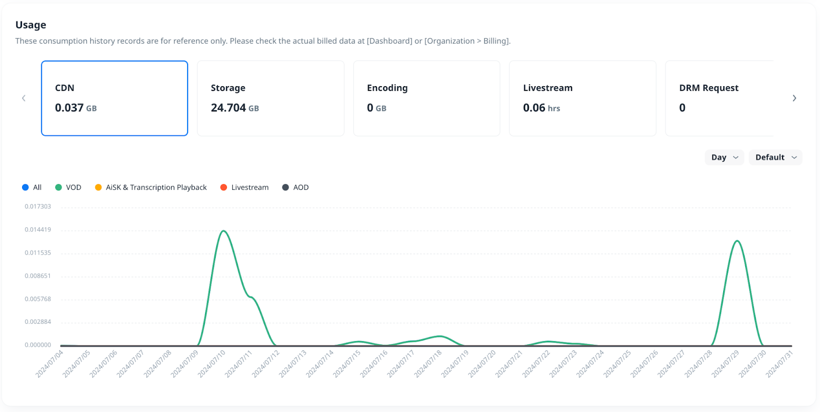 Note: These consumption history records are for reference only. For the actual billed data, please check Organization > Billing.