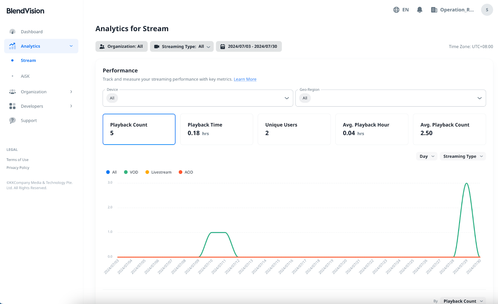 • Click on the right drop-down menu to switch between the dimensions: Streaming Type, Device, Geo-Region, and Business(=sub-organization)