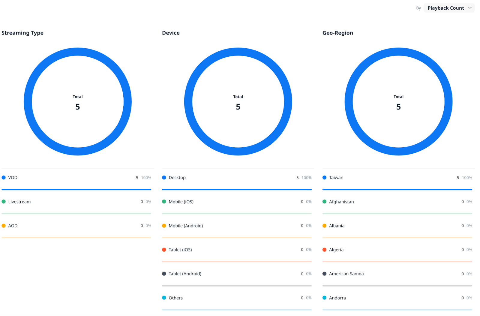 Press the dropdown menu shown on the upper right side of the pie chart to switch the data calculated based on the metrics between Playback Count and Playback Time: