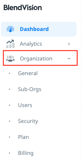 • Click “Organization” on the sidebar to open the drop-down menu on the BlendVision web console.