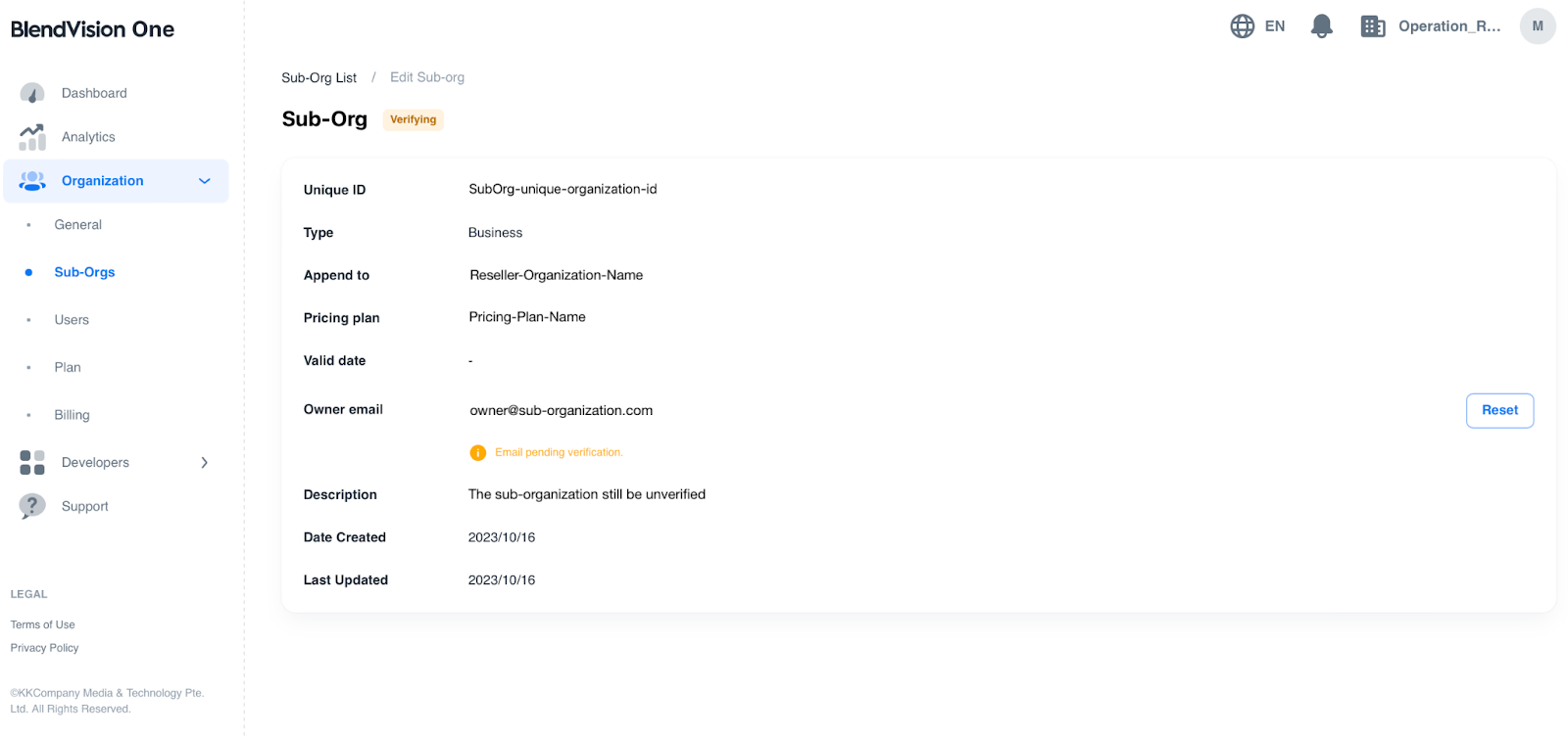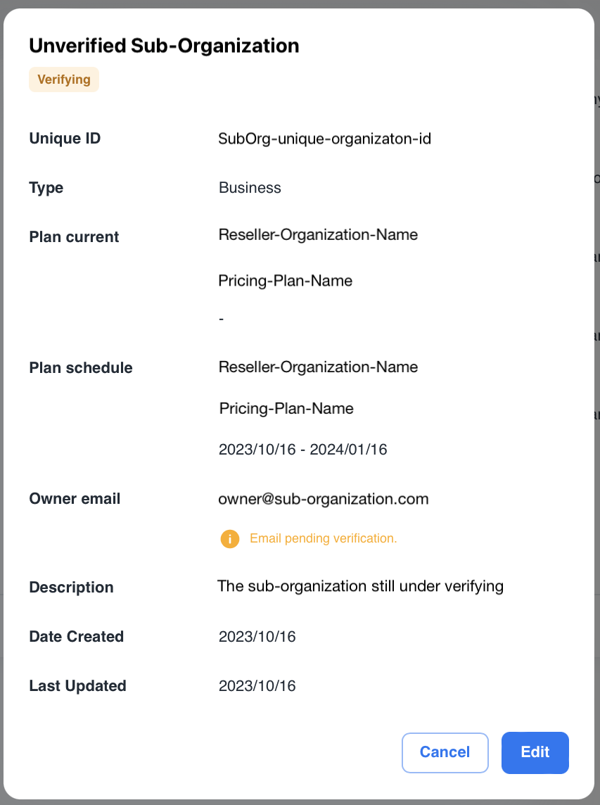 For the sub-organization status is “Verifying”, you can only press “Reset” button to change the owner email or resend the invitation email to the owner.