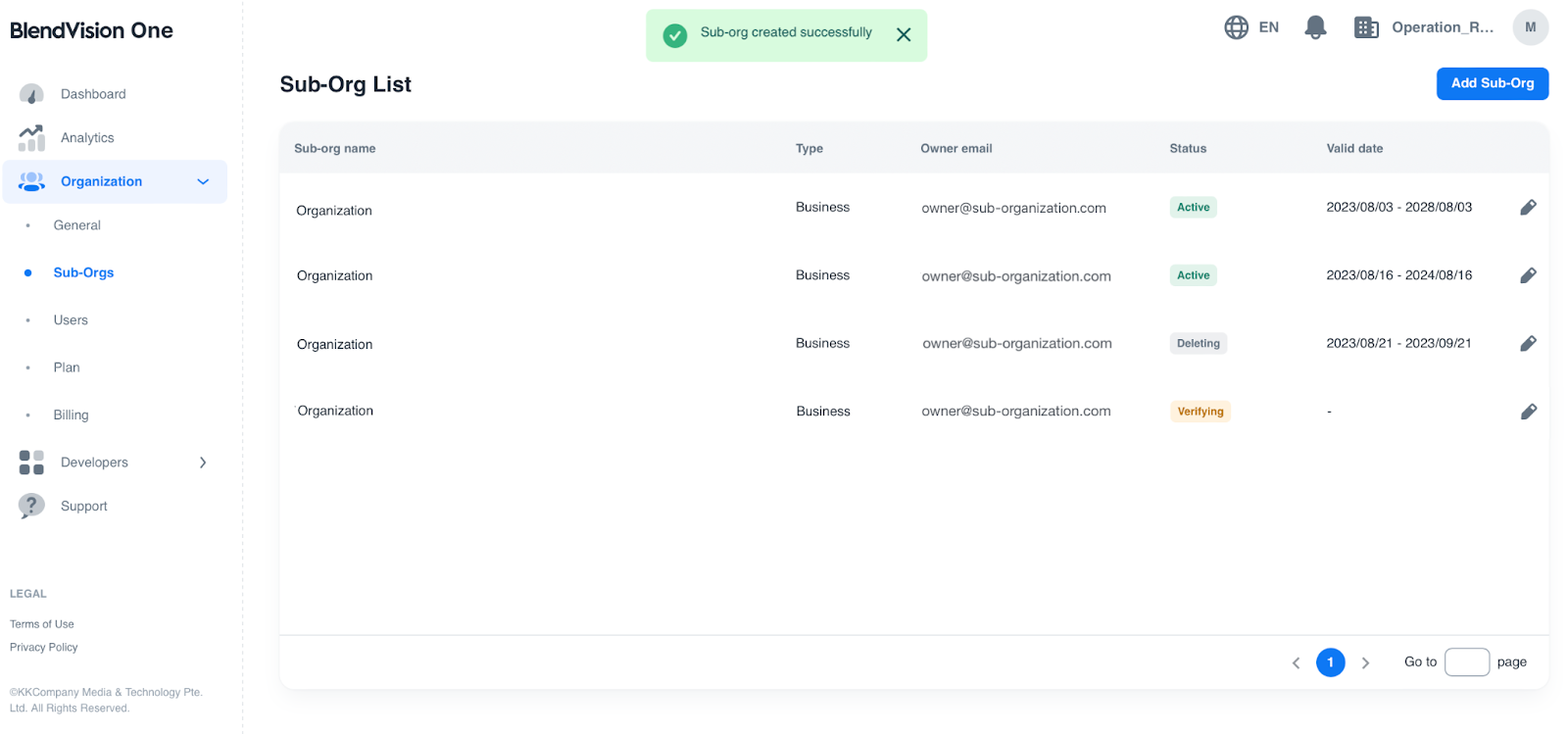 4. After deleting, you will be redirected to the Sub-Orgs page and a notification will be displayed. You can still confirm the deleted sub-organization in the Sub-Org list and the status will shown as “deleting”