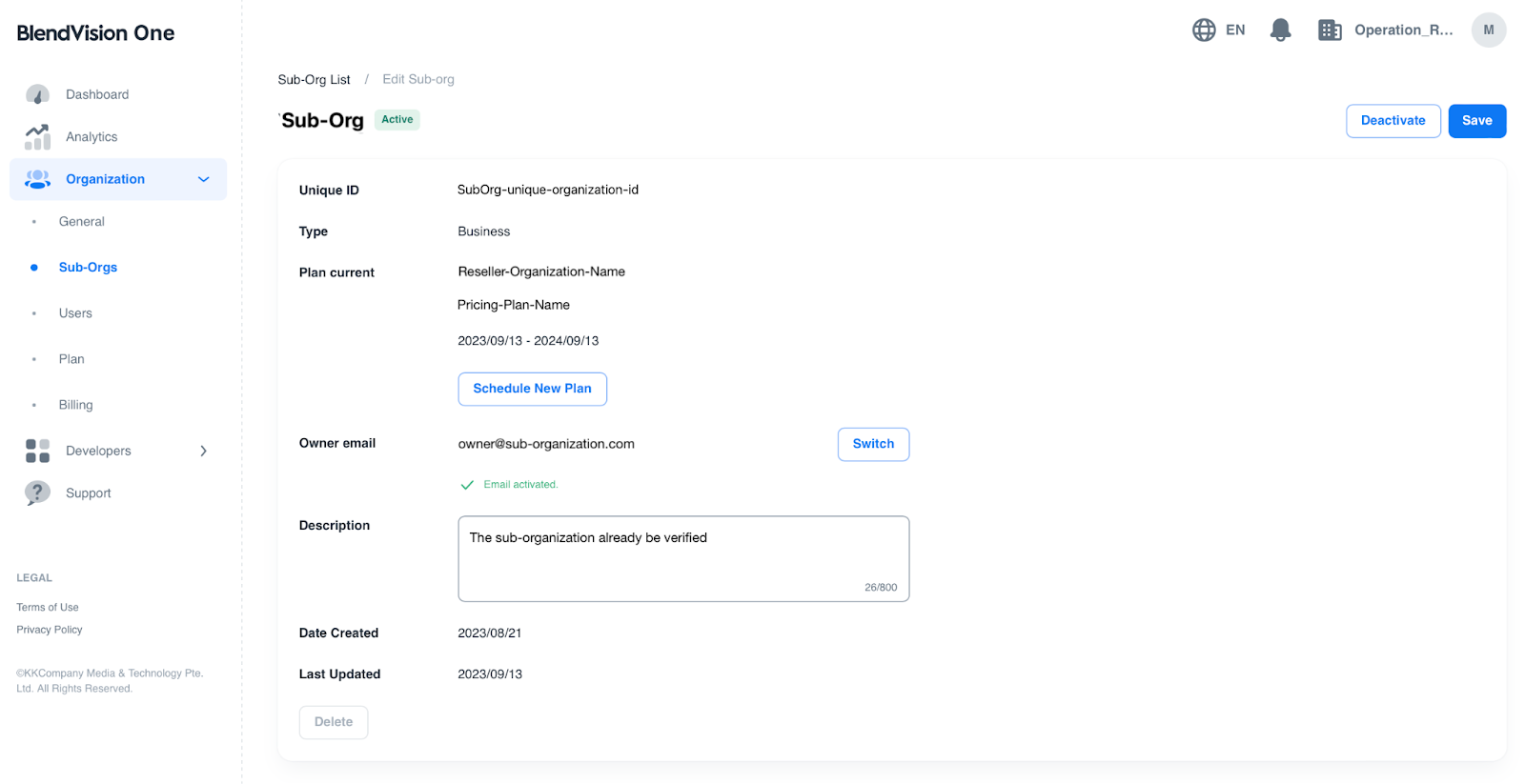 Press “Deactivate” or “Activate” button to manage the status of the sub-organization.