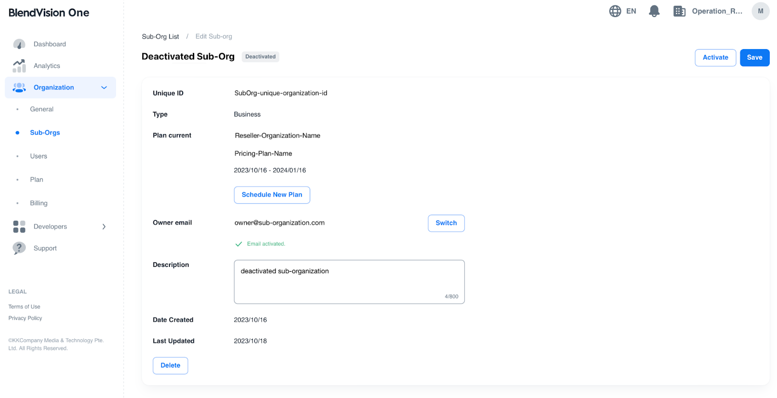 Note: the “Delete” button only be available when the sub-organization is deactivated.