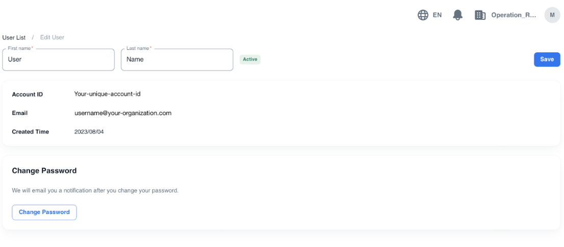 Note: The email address of the account is uneditable. Please create a new account by sending the invitation to the new email address if needed.