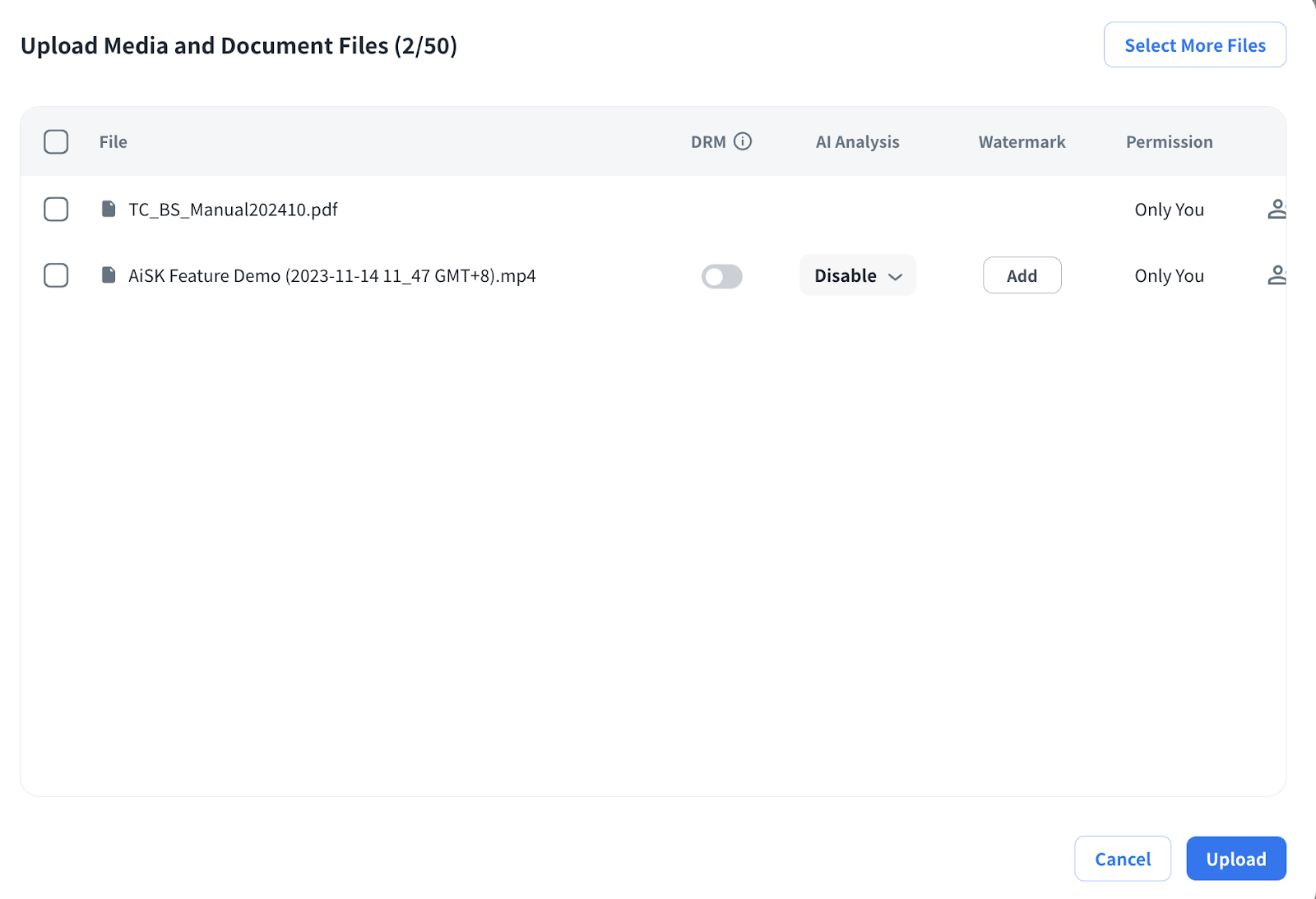 1. Click “Add” button to add watermark when uploading your media file. If you want to know how to upload media content, please refer to Create Media/Document File for more information.