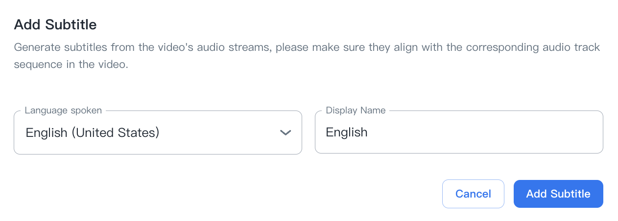 • Choose “Language spoken” and input “Display Name”, then click “Add Subtitle”.