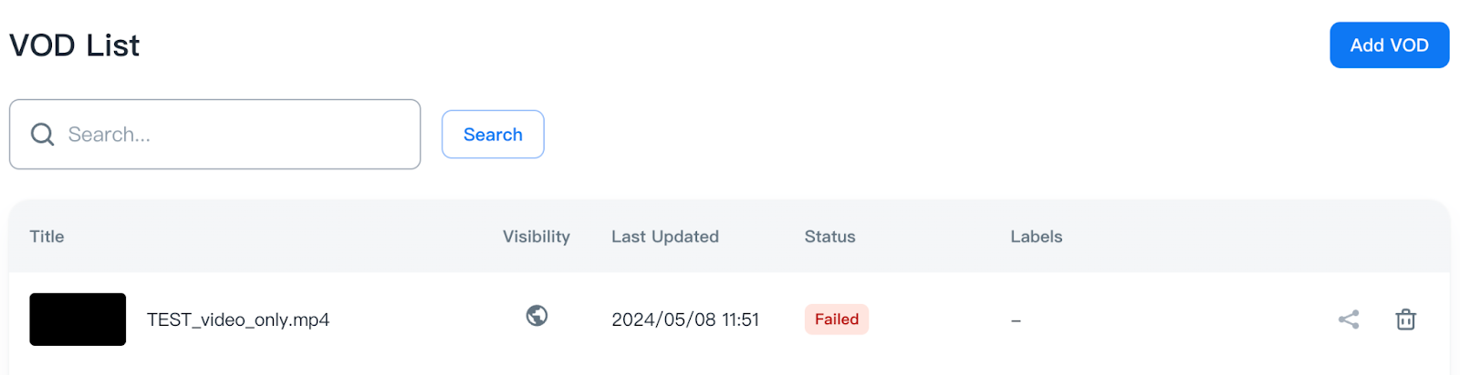 You can confirm the failed VOD in the VOD List and delete it via the delete icon.