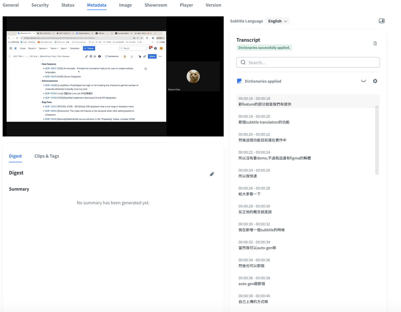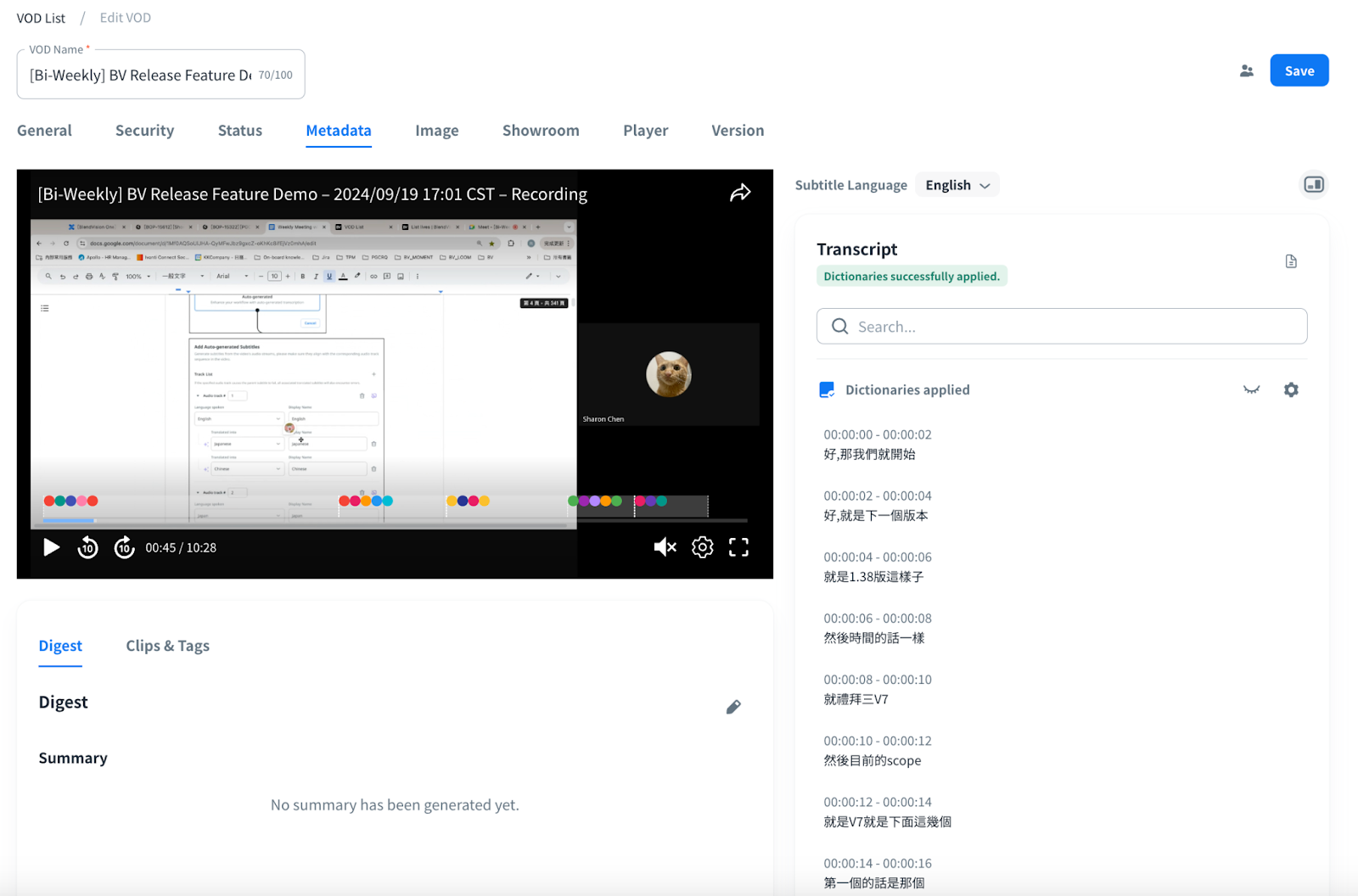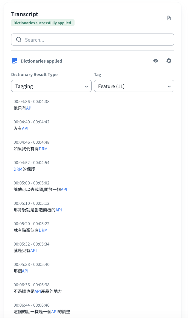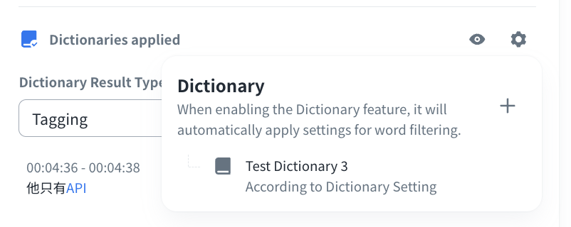 You can apply dictionaries to identify sensitive terms in VOD subtitles or transcription results at the stage of VOD creation and you can confirm the results under the Transcript section.