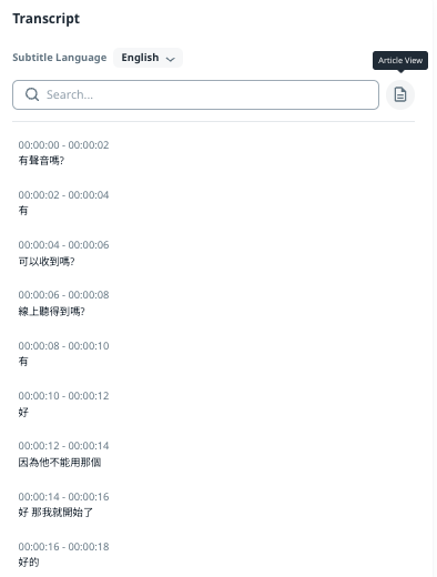 There are 2 display views for the transcription, Article View and List View. The default view is Article View where you can confirm the time range of each transcription.