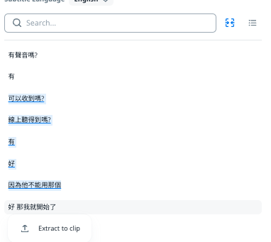 You can click “Extract to Clip” icon between search bar and List View icon, and make a certain paragraph of transcription to enable the “Extract to clip” feature.