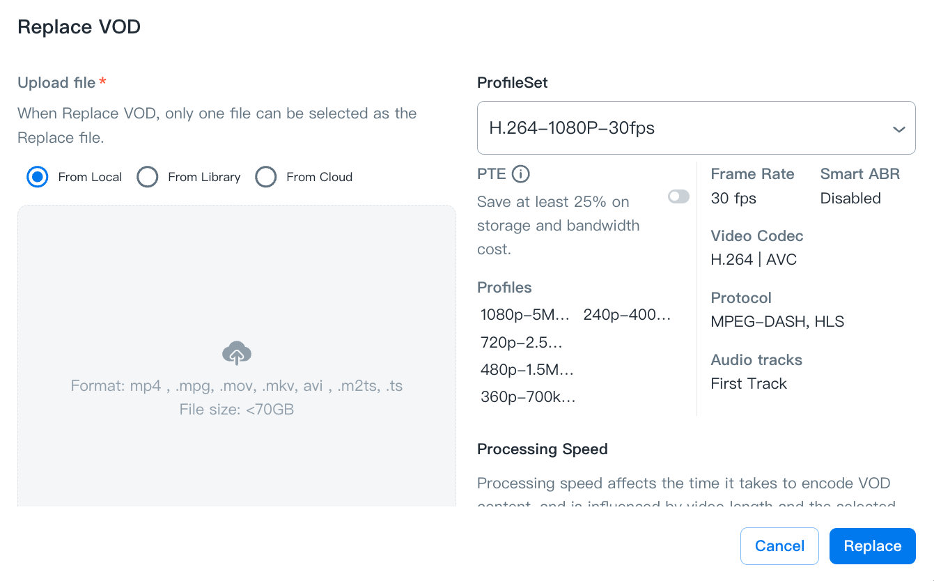 - Upload the file you want to replace from Local/Library/Cloud and set up the ProfileSet and Processing Speed.