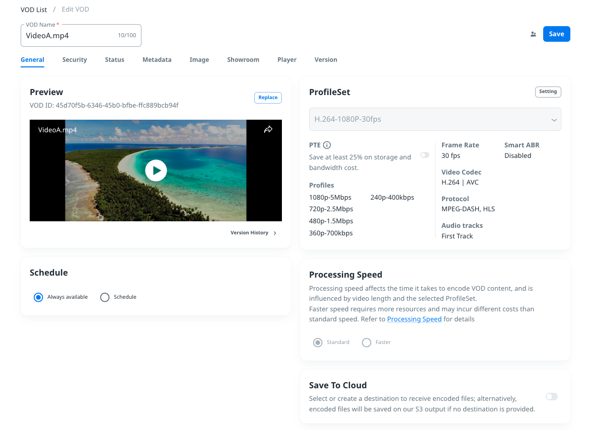 Note: ProfileSet / Processing Speed / Save to Cloud will be uneditable once the VOD is created.