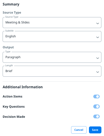 Action items, key questions and decision made will be displayed when “Meeting & Slides” is selected as source type.