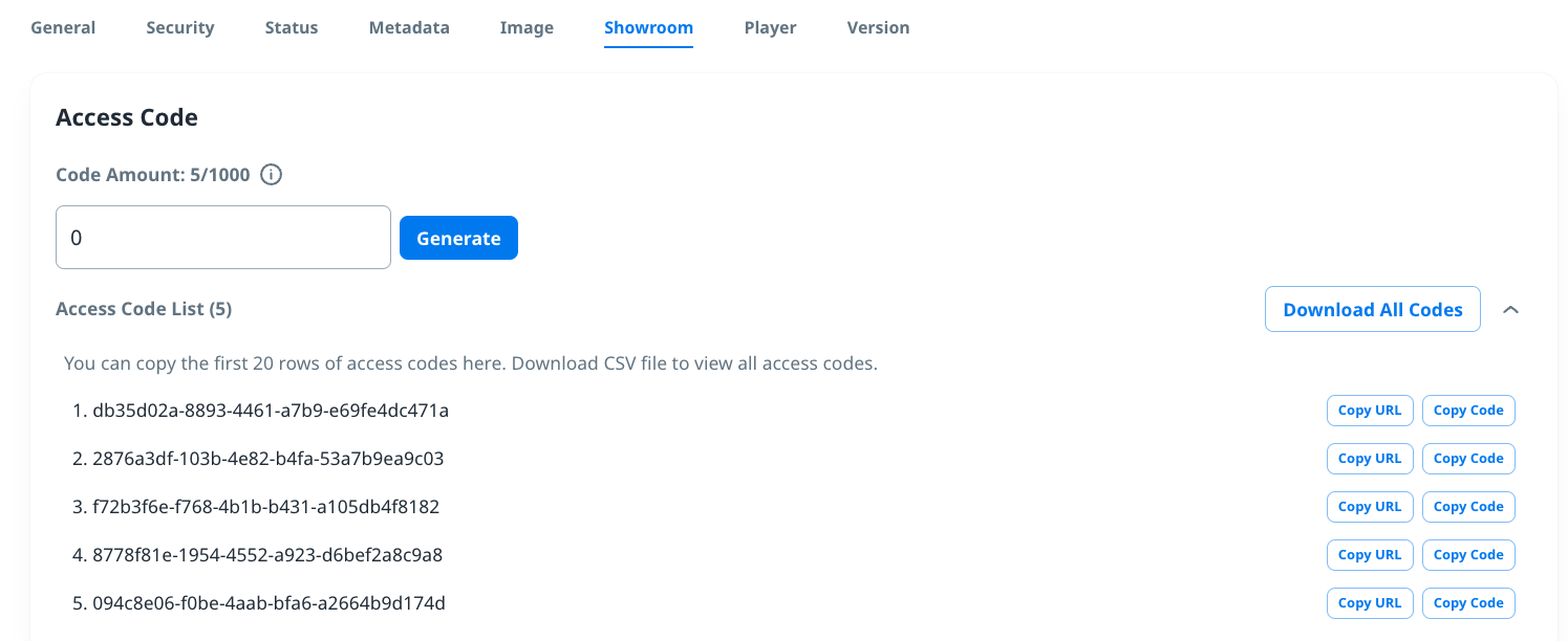 As shown in the image below, after you create a piece of content, you can see the “Access code” section displayed in the “Showroom” tab of the settings page for your content.