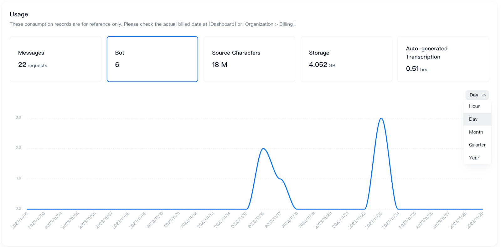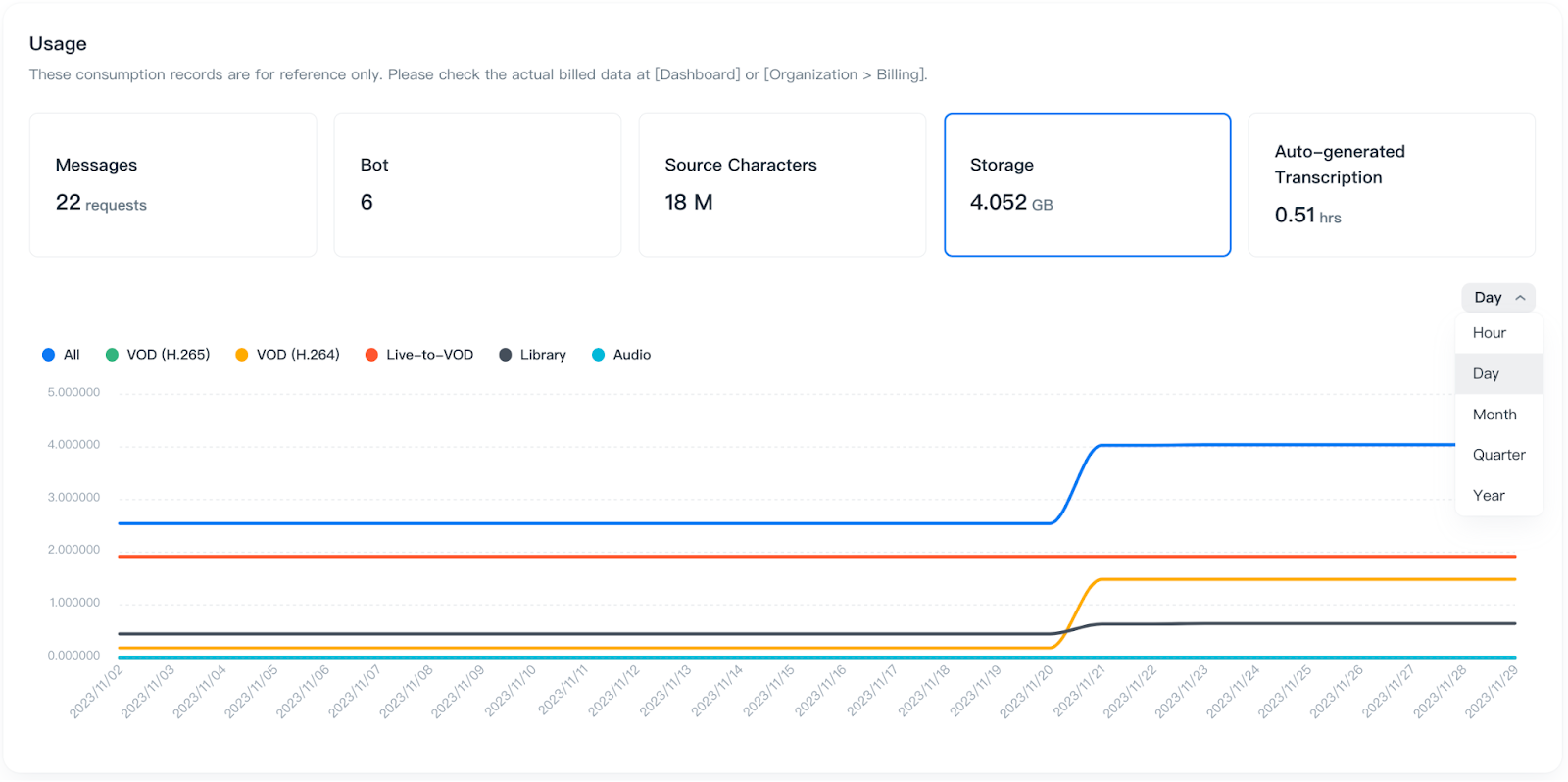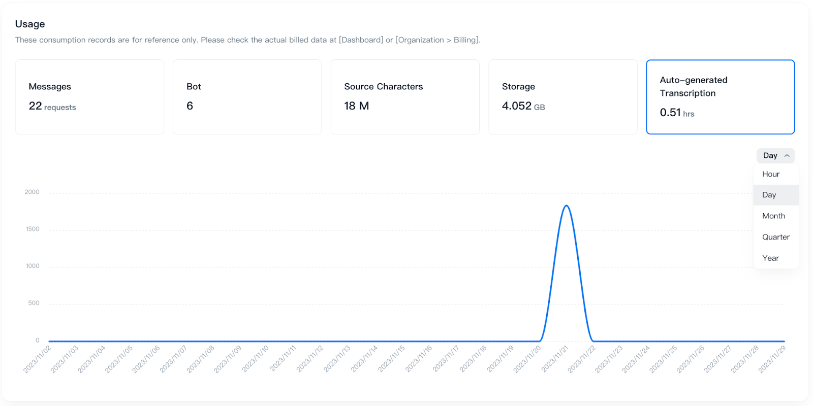 These consumption records are for reference only. Please check the actual billed data at [Dashboard] or [Organization > Billing].