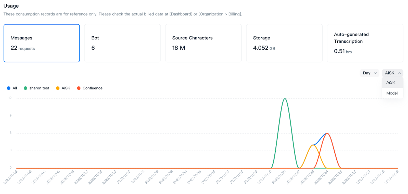You can confirm the Messages count based on each AiSK or each Model by dropdown.
