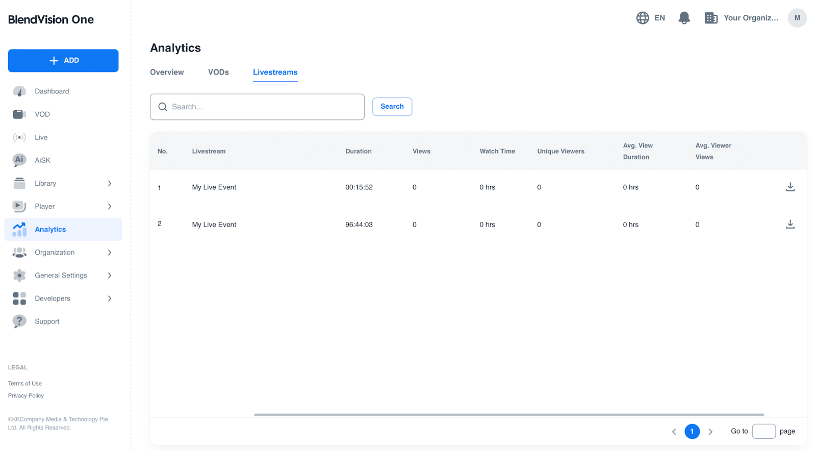 1. 參考單一直播分析來訪問分析模組中的「直播」標籤,然後從表格中找到您想要下載分析報告的直播活動: