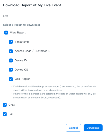 3. 彈出窗口將出現如下。您可以設定報告的開始/結束時間(針對 VOD),選擇您需要的維度,然後按下「下載」按鈕開始下載。