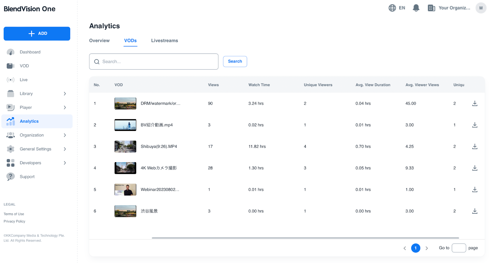 1. 參考單一 VOD 分析來訪問分析模組中的「VOD」標籤,然後從表格中找到您想要下載分析報告的影片: