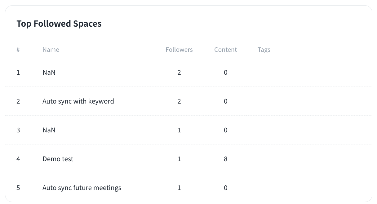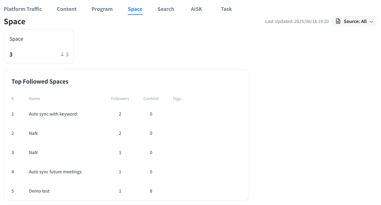 • Top Followed Spaces: The space information with most followers. Click space to access space’s detailed page
