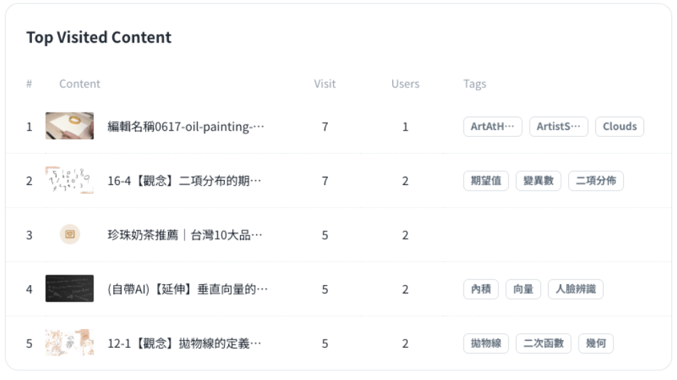• Top Visited Content: The most visited content information. Click content  to access the content’s detailed page.