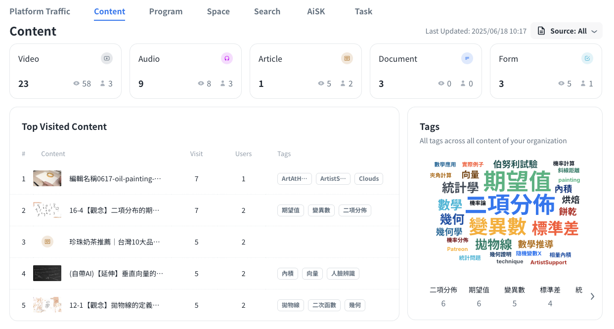 • Content list (Video/Audio/Article/Document/Form): Hover to confirm the amount of your content, content views and viewers.