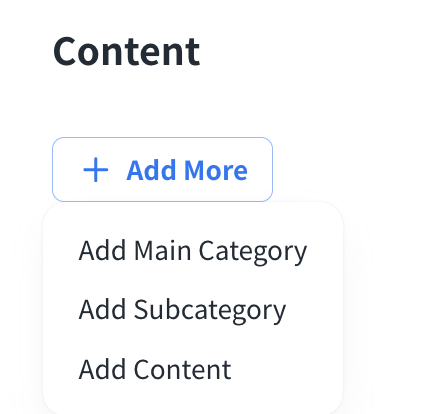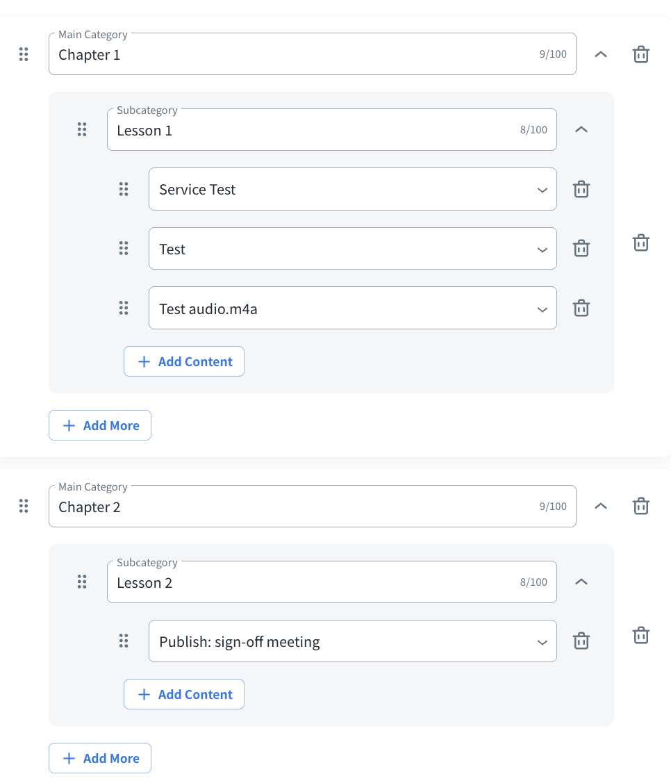 1. Content: Start to add all the contents you want to include in this program. To organize your program, you can arrange the levels clearly from Main Category, Subcategory, and Content.