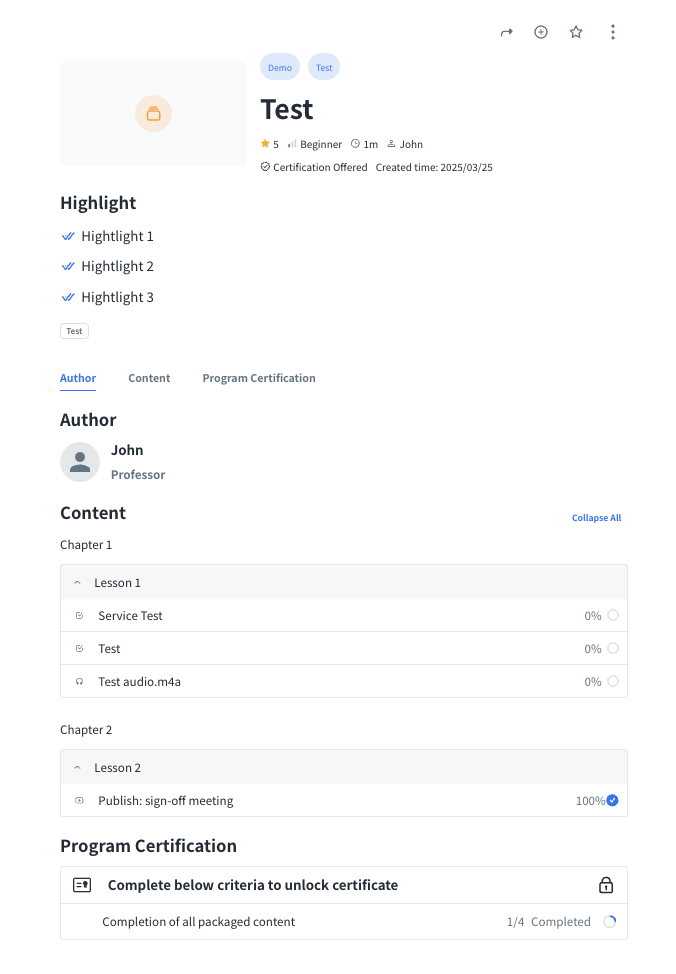 A program is used to organize the related contents to build a systematic introduction or create a series of courses for users. Besides, a program can provide a certificate. You can establish the conditions for learners to obtain a certificate for your program.