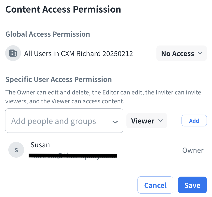 12. Permission: Share the program to your users by clickingicon, where you can grant the access permissions to the users or specific people/groups in the organization under Specific User Access Permission.